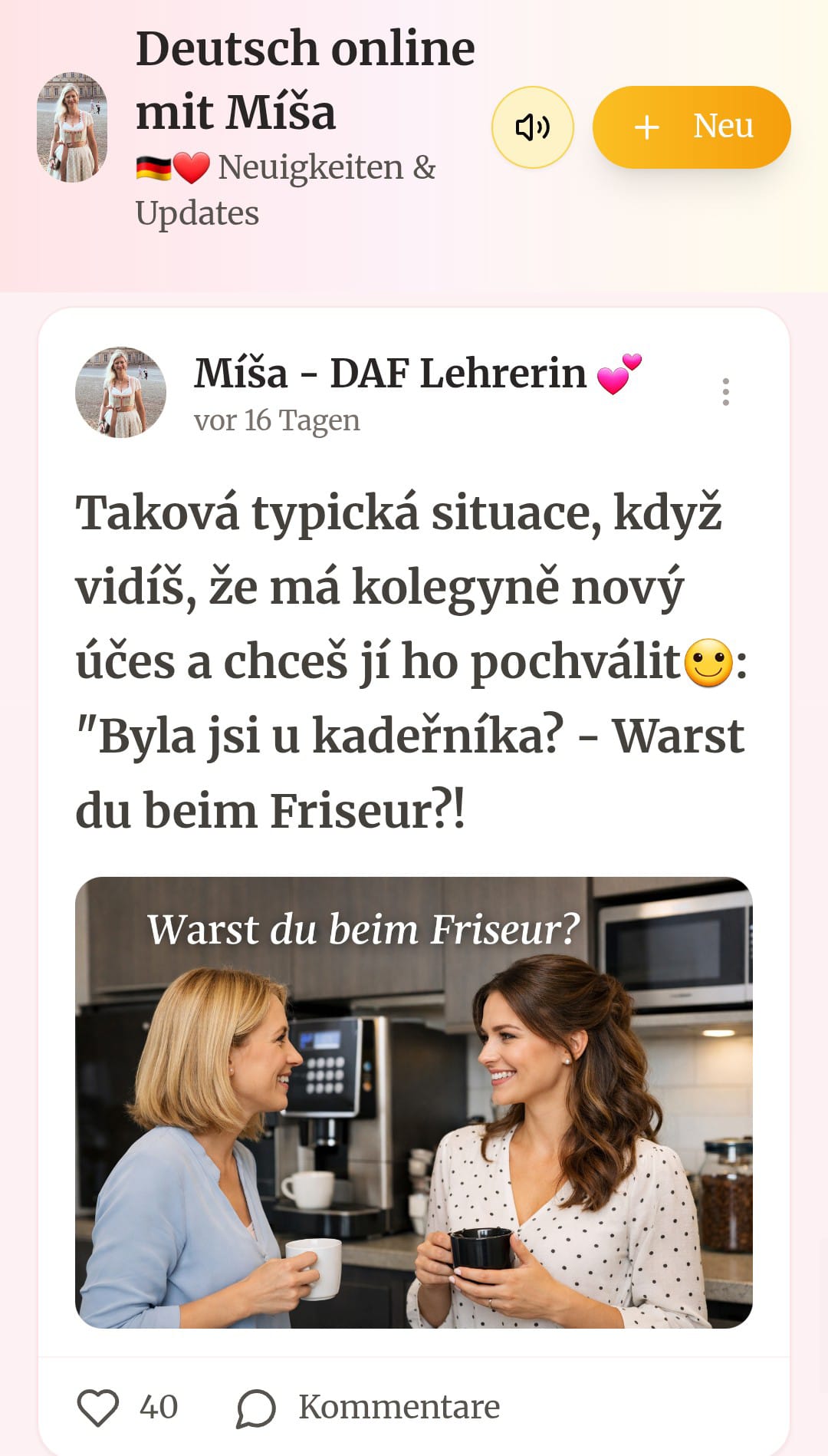 Odteď máš vše ve Tvém telefonu a můžeš se začít zlepšovat kdekoliv - v tramvaji, když čekáš na děti ve školce, když tankuješ, dokonce i když prokrastinuješ na instagramu nebo na záchodě.... 😅 Pípnu Ti tam! A místo nekonečnýho scrollování bez cíle se posuneš o krok blíž k plynulé němčině! To uvidíš, jak rychle se zlepšíš! Na jedno kliknutí a bez přihlašování, hledání a scrollování a ztráty motivace, které Ti berou půlku chuti do učení🙈..... Mám pravdu?!