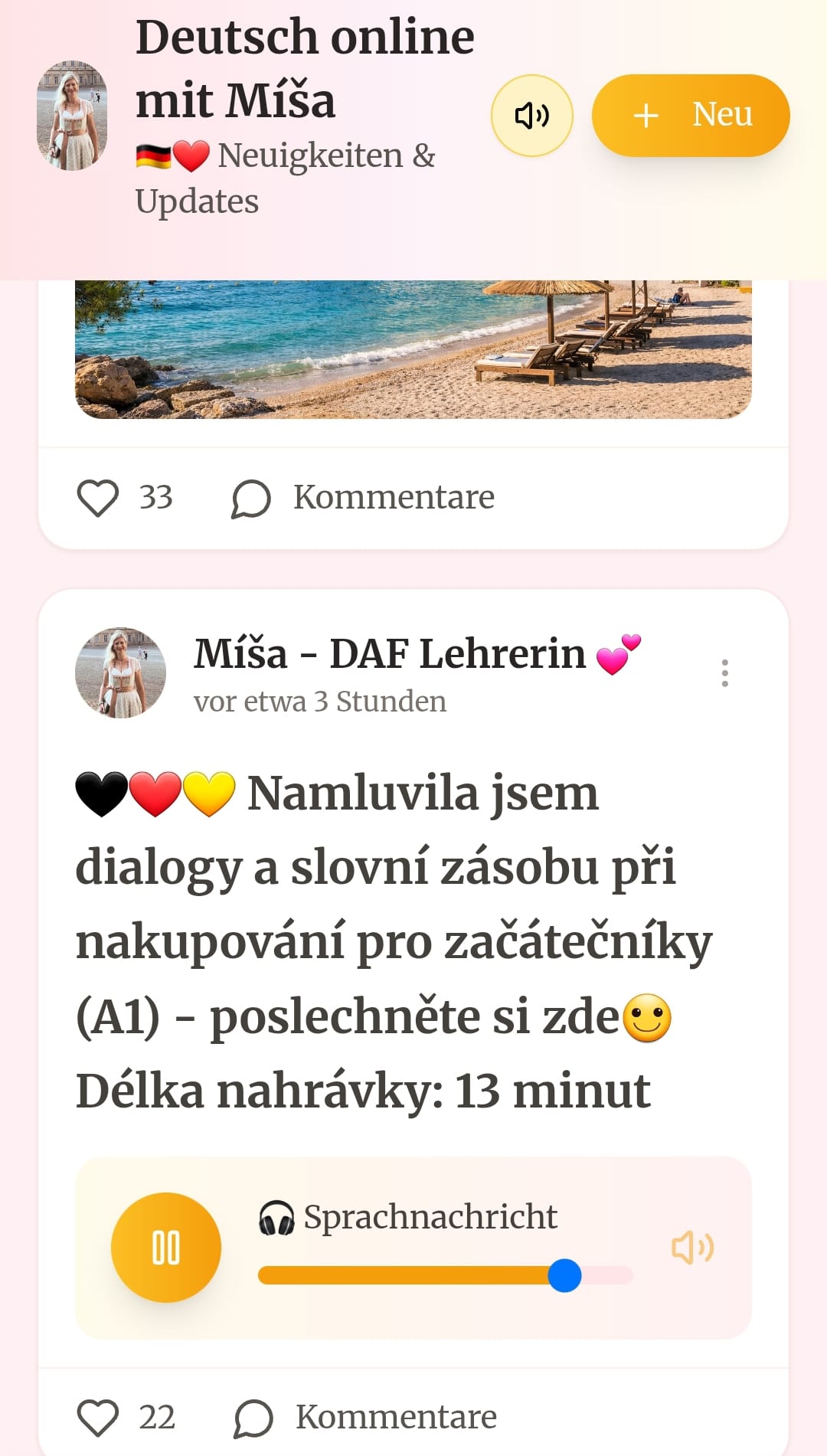 Jsem Míša Ullmannová a pracuji jako lektorka němčiny již 18 let. Celá rodina z taˇˇtkovy strany je německá, takže jsem němčinu slyšela už jako malá. Němčinu jsem vystudovala na TU v Liberci a v Berlíně. Na sociálních sítích jsem nyní 5 let, za sebou mám přibližně 20.000 odučených lekcí v jazykových a firemních kurzech pro velké a známé firmy v ČR (Škoda Auto, Jablotron, Magna, Fehrer, Gennet, Skřivánek, Polyglot). V němčině tvořím transformační jazykové programy, které pomáhají lidem slyšet rodilou němčinu tak, jak se skutečně používá. Mojí motivací je to, aby každý, kdo se mnou pracuje, cítil intenzivní radost ze svého pokroku. Němčina pro mě není jen předmět – je to nástroj, jak dát lidem jistotu, klid a radost z toho, že opravdu rozumí. Jak jim pomoci zlepšit a transformovat jejich život v německy mluvící zemi. Neučím jen slovíčka a gramatiku. Učím lidi cítit němčinu. Protože jazyk nejsou jen slova – je to kontext, jsou to životní zážitky v cizině, je to každého jedinečná životní cesta. Moc ráda po ní půjdu kousek s vámi😊.